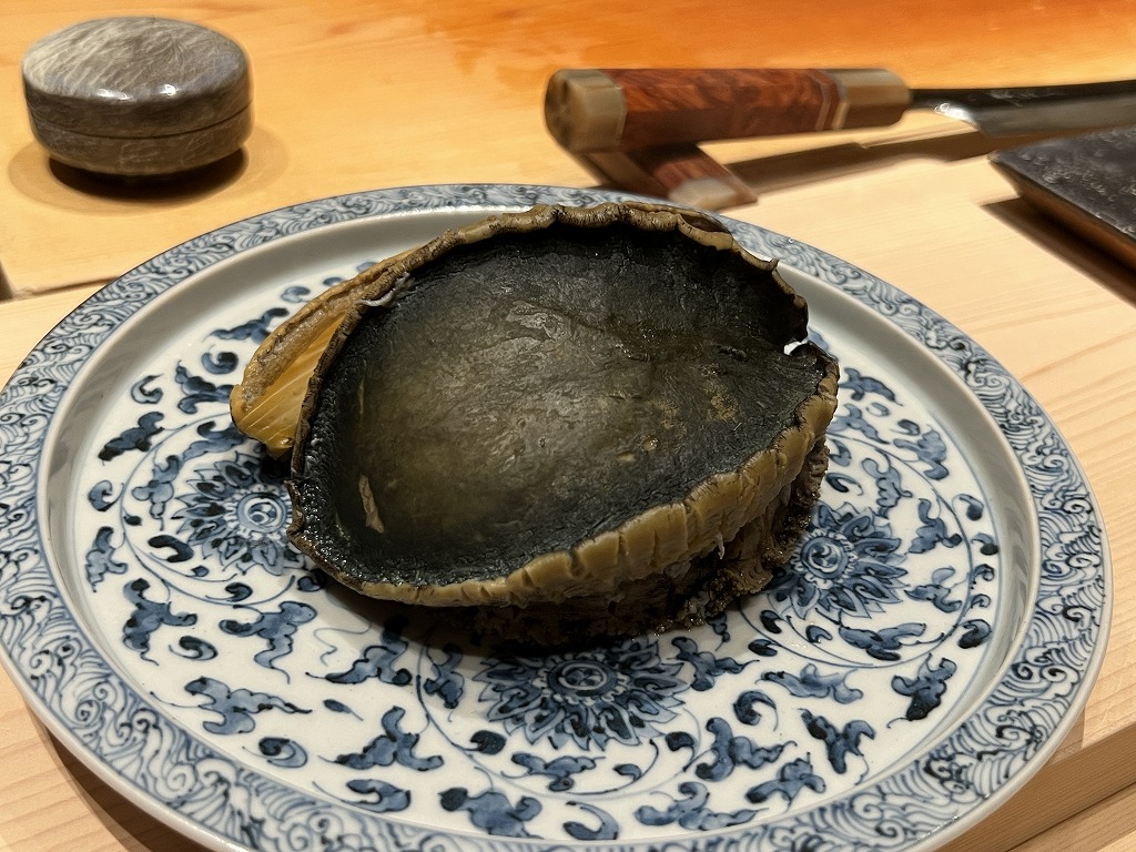 アワビは肉厚で肝ソースが濃厚で美味い。